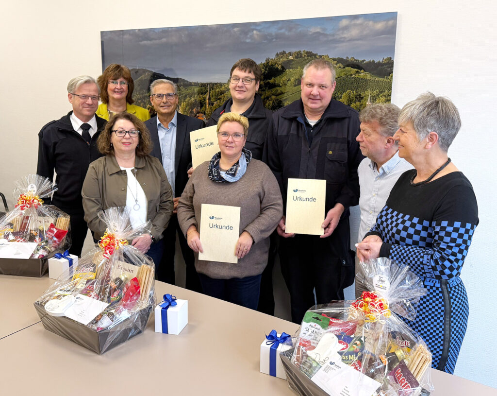 Bensheim | 9. Dezember 2025 Drei Mitarbeitende der Stadtverwaltung blicken in diesem Jahr auf ein besonderes Jubiläum zurück: Seit einem Vierteljahrhundert prägen sie mit ihrem Engagement, ihrer Erfahrung und ihrem täglichen Einsatz die Stadtverwaltung. Für 25 Jahre im Öffentlichen Dienst erhielten nun Tanja Rettig, Jürgen Ritz und Peter Karn von Bürgermeisterin Christine Klein eine Urkunde sowie einen Präsentkorb. Mit der Ehrung würdigte die Stadt nicht nur die langjährige Dienstzeit, sondern vor allem die Leidenschaft, die das Trio seit vielen Jahren in seine Aufgaben einbringt.