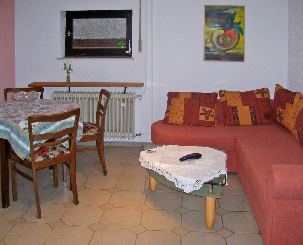 Die Ferienwohnung im Stadtteil Schwanheim ist mit Küche, Wohnzimmer, Schlafzimmer mit 3 Betten und einem Bad mit großer Dusche auf Bodenebene ausgestattet.